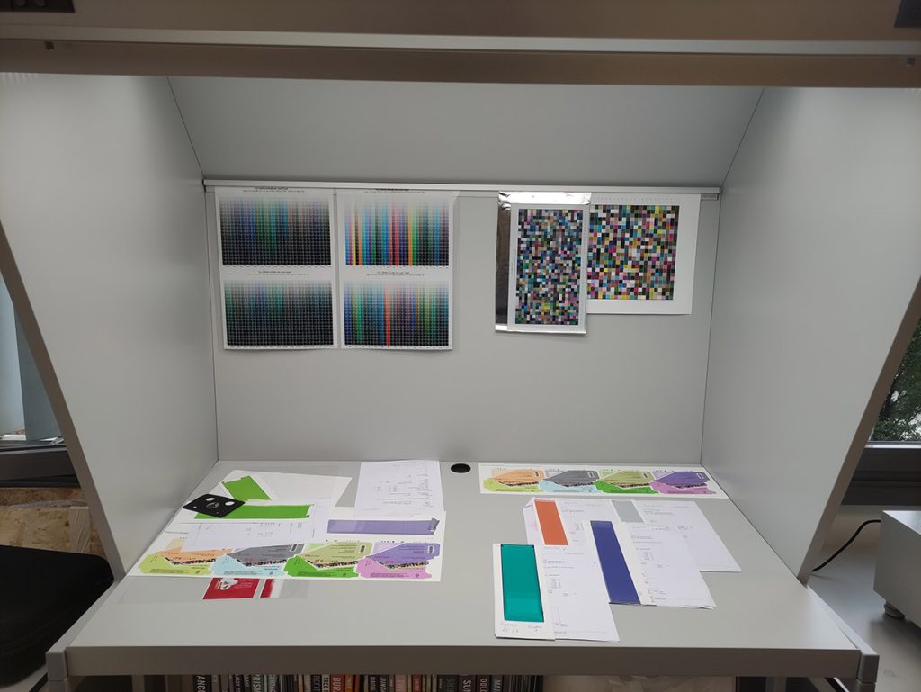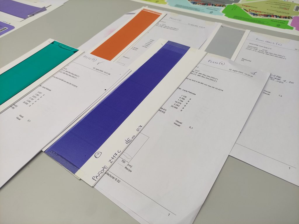 Per affrontare questa esigenza, Pantone® ha sviluppato librerie “dependent”, che affiancano la libreria “master” (ad esempio la celebre Solid Coated). In queste librerie, i colori sono stati ristampati e codificati colorimetricamente utilizzando supporti e processi differenti, in modo da fornire riferimenti più aderenti alla realtà produttiva. Gli studenti coinvolti nella sperimentazione hanno quindi messo a confronto formulazioni di colori spot basate sia sulla libreria “master” che su una libreria “dependent”, valutando i risultati sia con strumenti di misurazione che attraverso l’osservazione visiva.